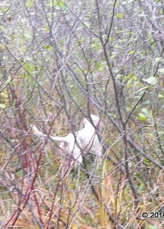 Mia pointing her first Ruffed Grouse, September 2010 in the Northwoods. Five months old.